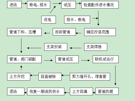 由于原一期水泵房設備無法同時滿足一二期工程要求,經設計院出更改圖紙,實施一期水泵房改造。主要內容為消防泵高壓出水管更換及試壓。